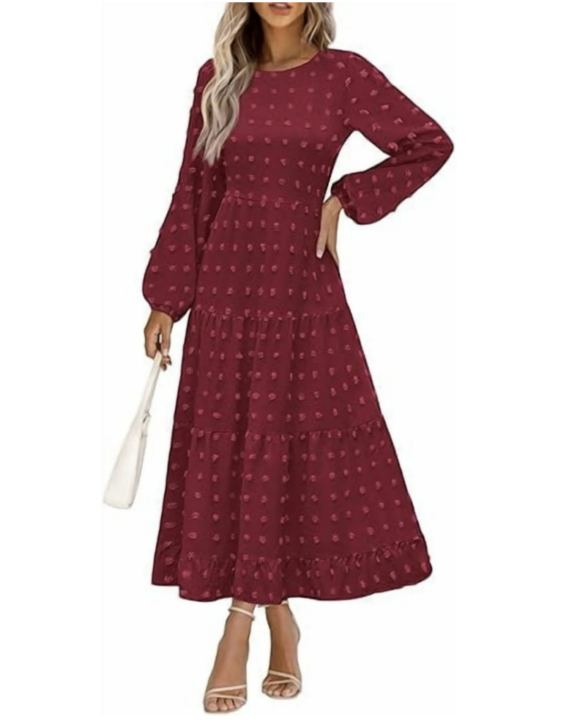 I tried on so many dresses for our family photos this year, including pricey ones from Madewell and Boden and this Walmart dress took the cake. It comes in a bunch of colors and I absolutely loved it – I went with the wine red color!