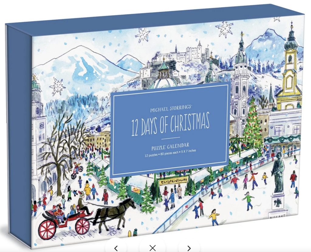 I’m completely smitten with this one—12 individual 80-piece puzzles, each featuring such fun and gorgeous holiday scenes from around the world! One puzzle a day makes the 12 days of Christmas feel extra special, and I love seeing all the festive illustrations come together.