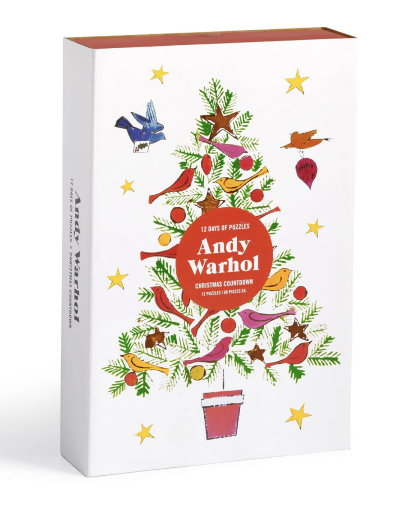 Add a pop-art twist to your holiday countdown! This 12-day advent features 12 individual 80-piece puzzles showcasing Andy Warhol’s whimsical Christmas paintings, drawings, and prints from the 1950s. Perfect for puzzle lovers and art fans!