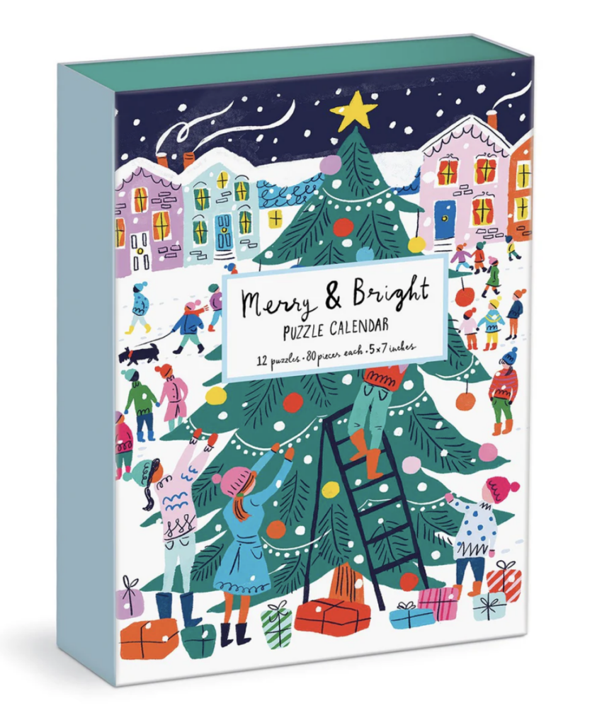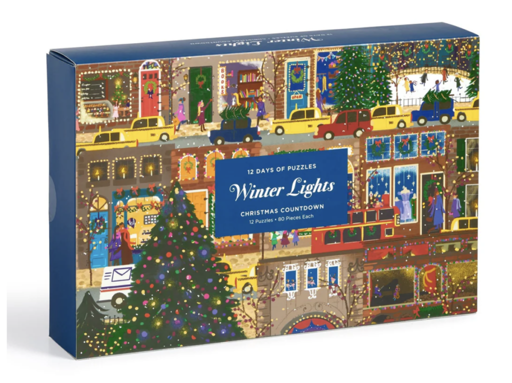 I absolutely love the colors and illustrations in this one – they’re so much fun! This 12-day advent features twelve individual 80-piece puzzles by Louise Cunningham Starling, each with a whimsical holiday scene. One puzzle a day makes the 12 days of Christmas feel extra cheerful and playful.