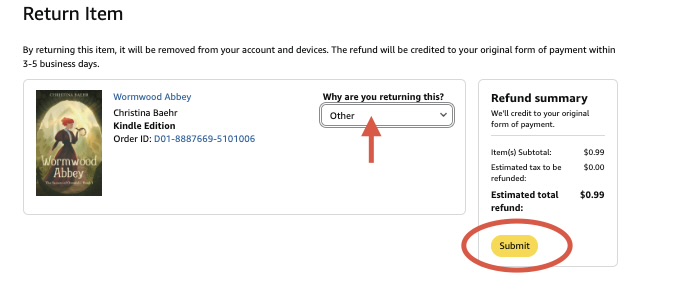 It will then ask you the reason you are returning. Select your reason, click submit and there you have it! Your Kindle book has been returned and you have received a refund!