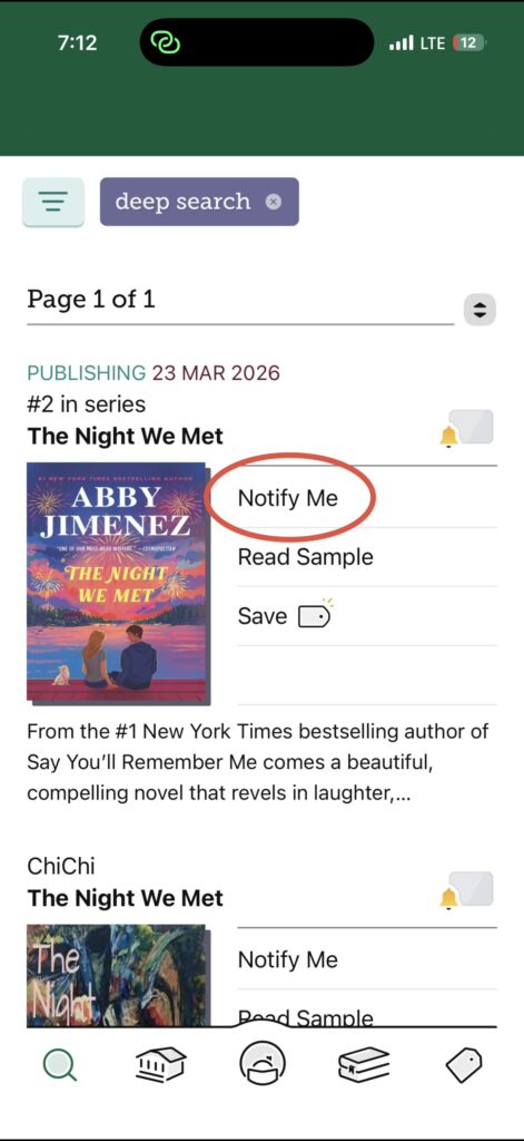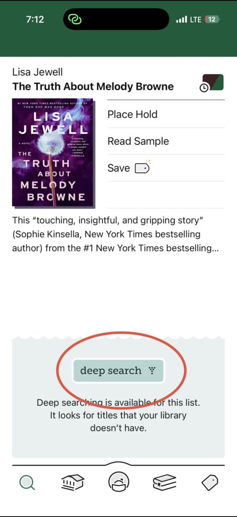 If you DON’T see the book you were searching for, click on “deep search.” Deep search is a feature that expands your search results beyond what your library currently has to offer and allows you to request Libby books. The book I was searching for didn’t show up until I clicked “deep search” and it populated right away. I was then able to place a Smart Tag on the book!